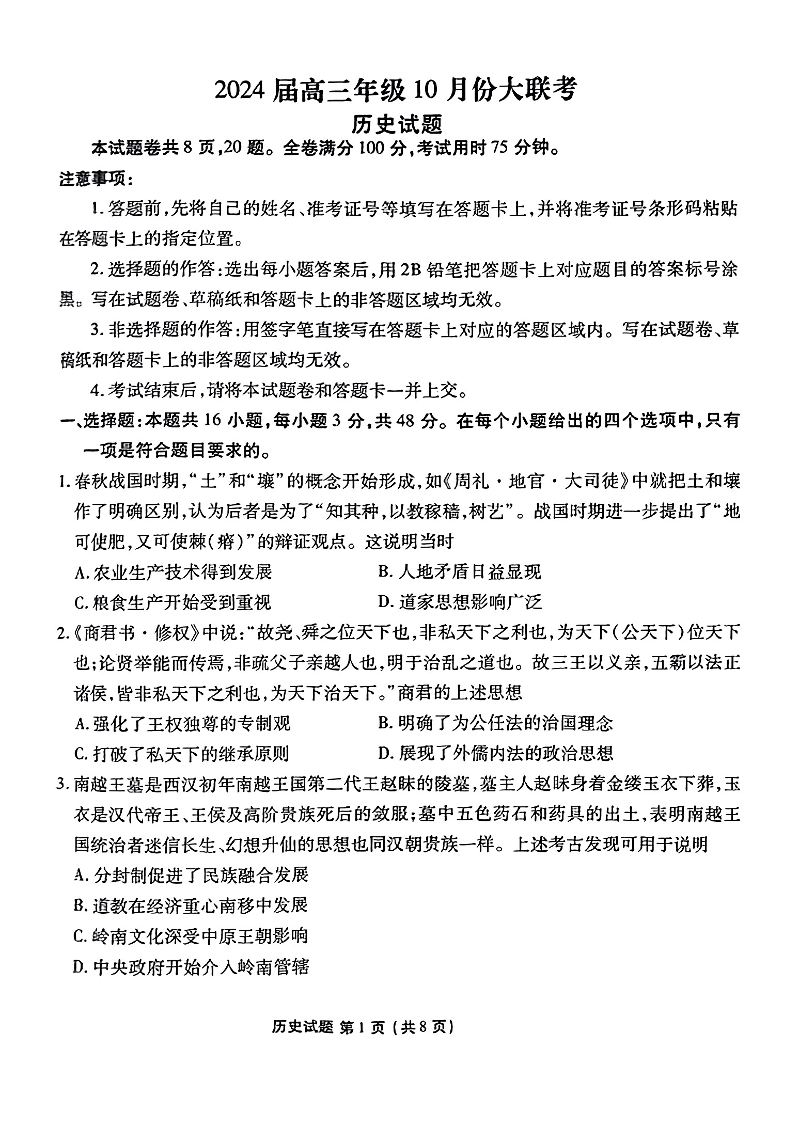 广东省衡水金卷2023-2024学年高三上学期10月份大联考 历史