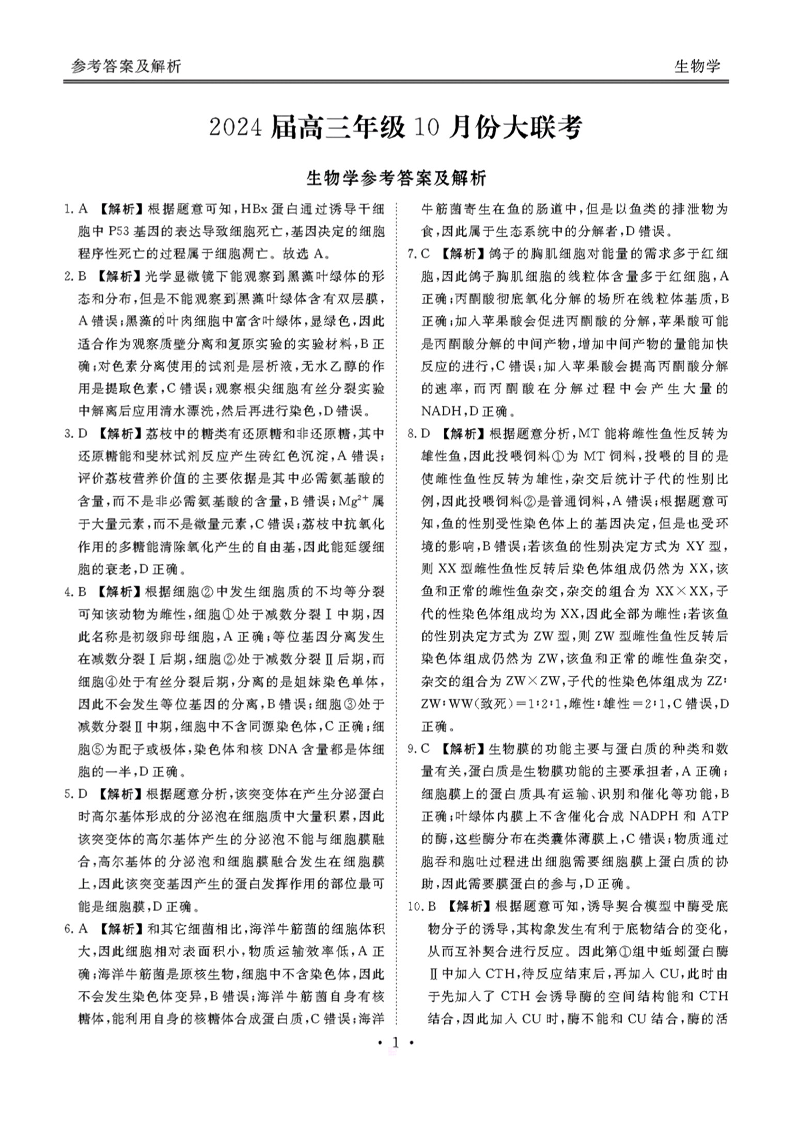 广东省衡水金卷2023-2024学年高三上学期10月份大联考 生物答案