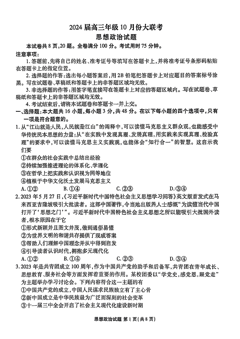 广东省衡水金卷2023-2024学年高三上学期10月份大联考 政治