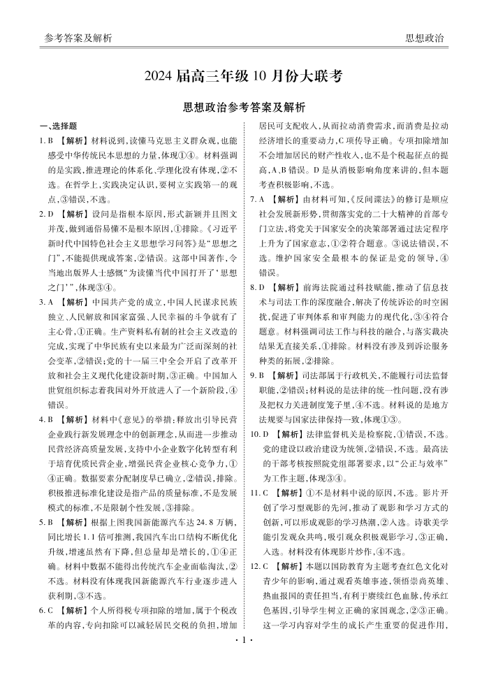广东省衡水金卷2023-2024学年高三上学期10月份大联考 政治答案
