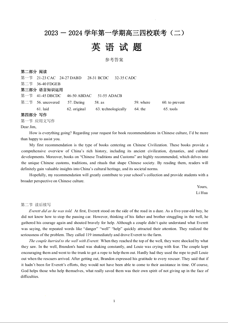 广东省四校2023-2024学年高三上学期联考(二)英语答案