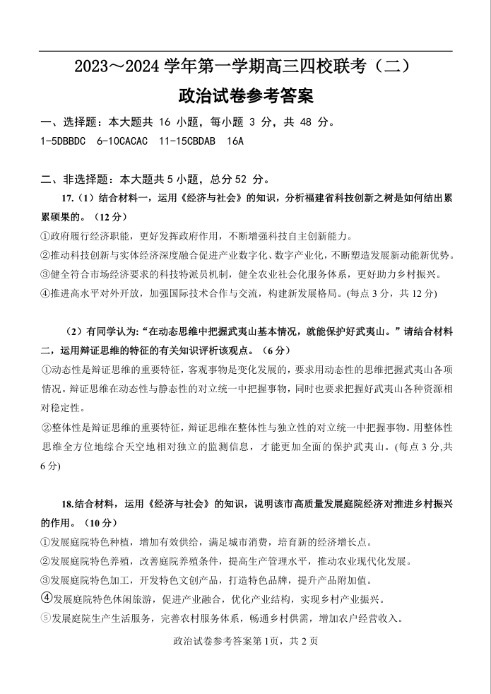 广东省四校2023-2024学年高三上学期联考(二)政治答案