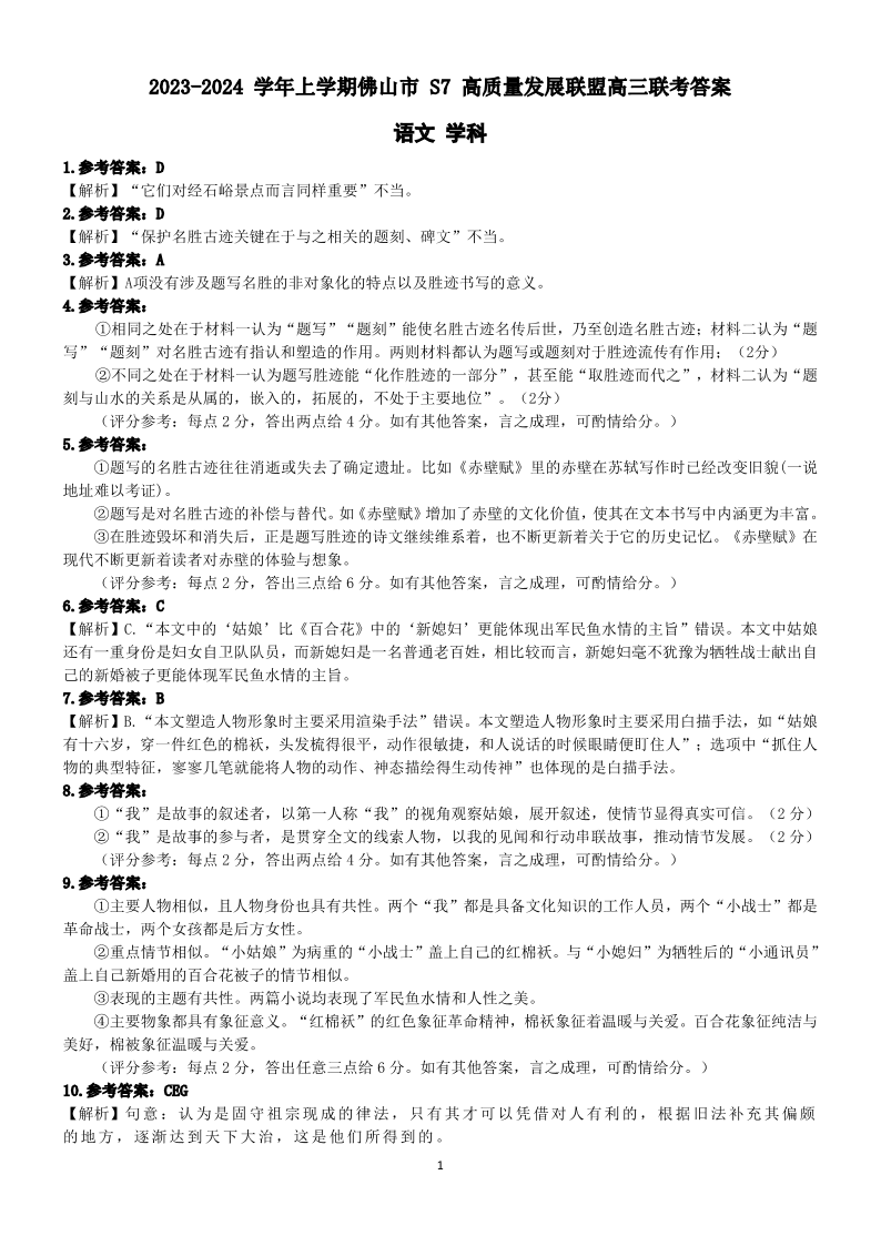 广东省佛山市S7高质量发展联盟2023-2024学年高三上学期10月联考 语文答案