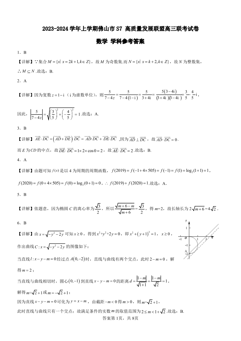 广东省佛山市S7高质量发展联盟2023-2024学年高三上学期10月联考 数学答案