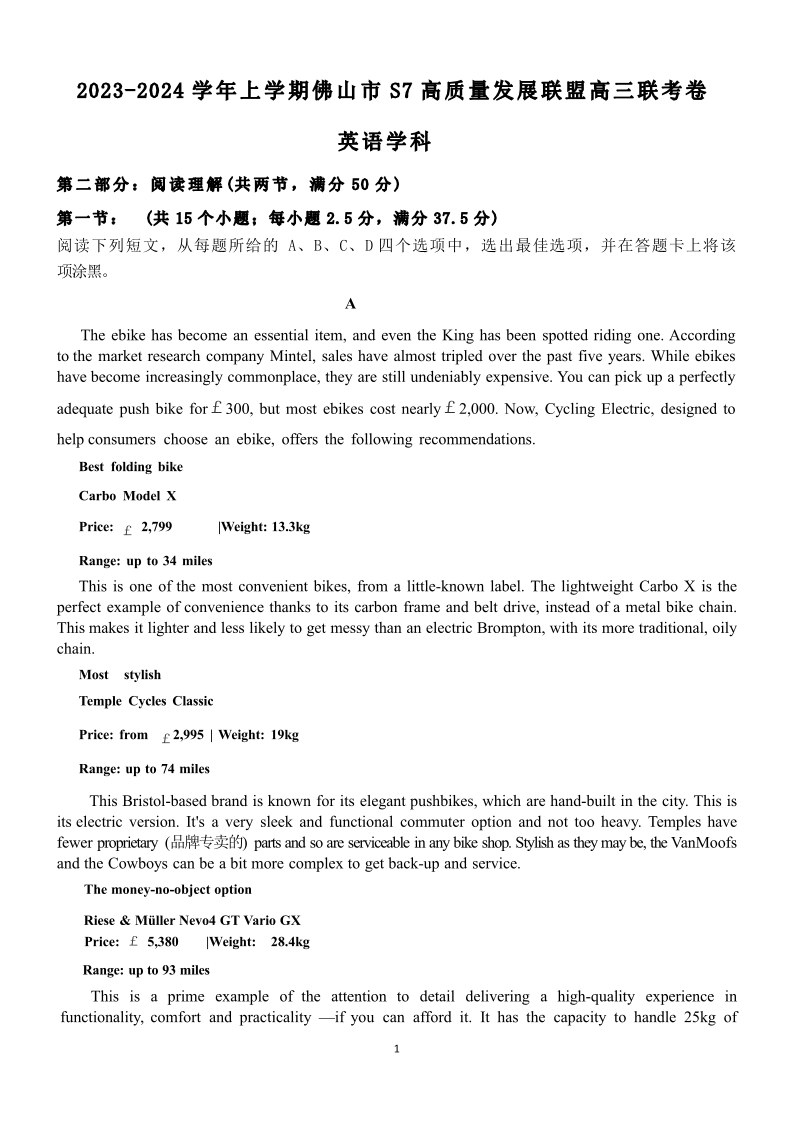 广东省佛山市S7高质量发展联盟2023-2024学年高三上学期10月联考 英语