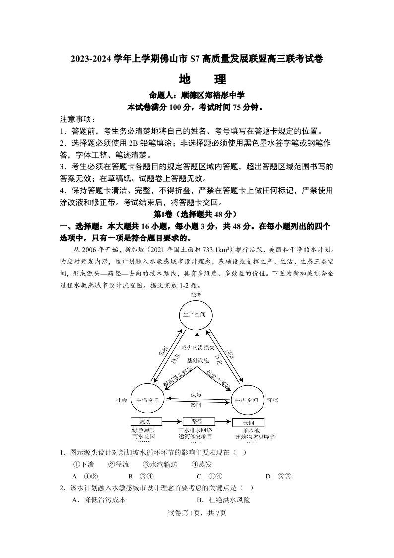 广东省佛山市S7高质量发展联盟2023-2024学年高三上学期10月联考 地理