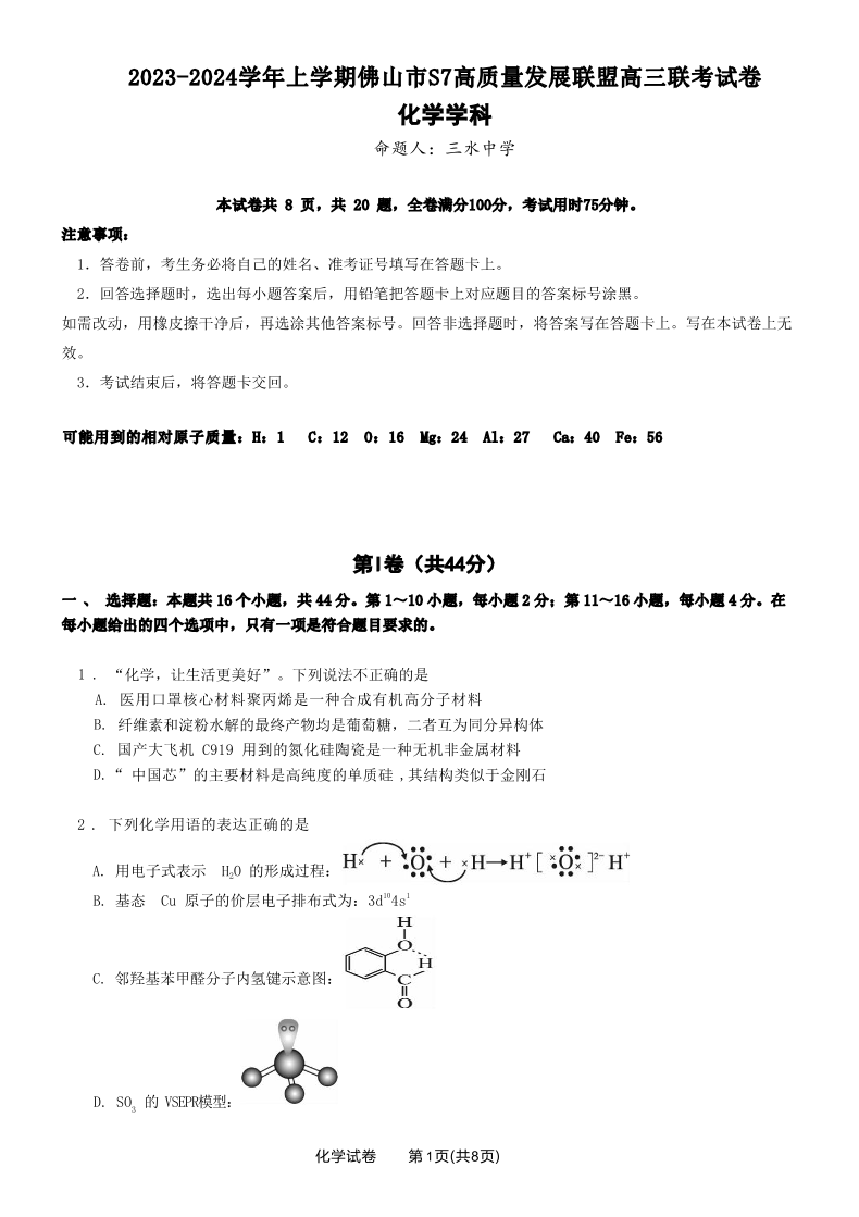 广东省佛山市S7高质量发展联盟2023-2024学年高三上学期10月联考 化学