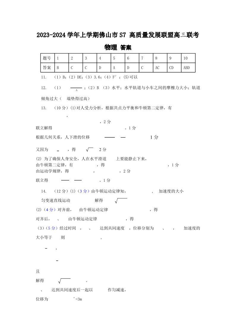 广东省佛山市S7高质量发展联盟2023-2024学年高三上学期10月联考 物理答案