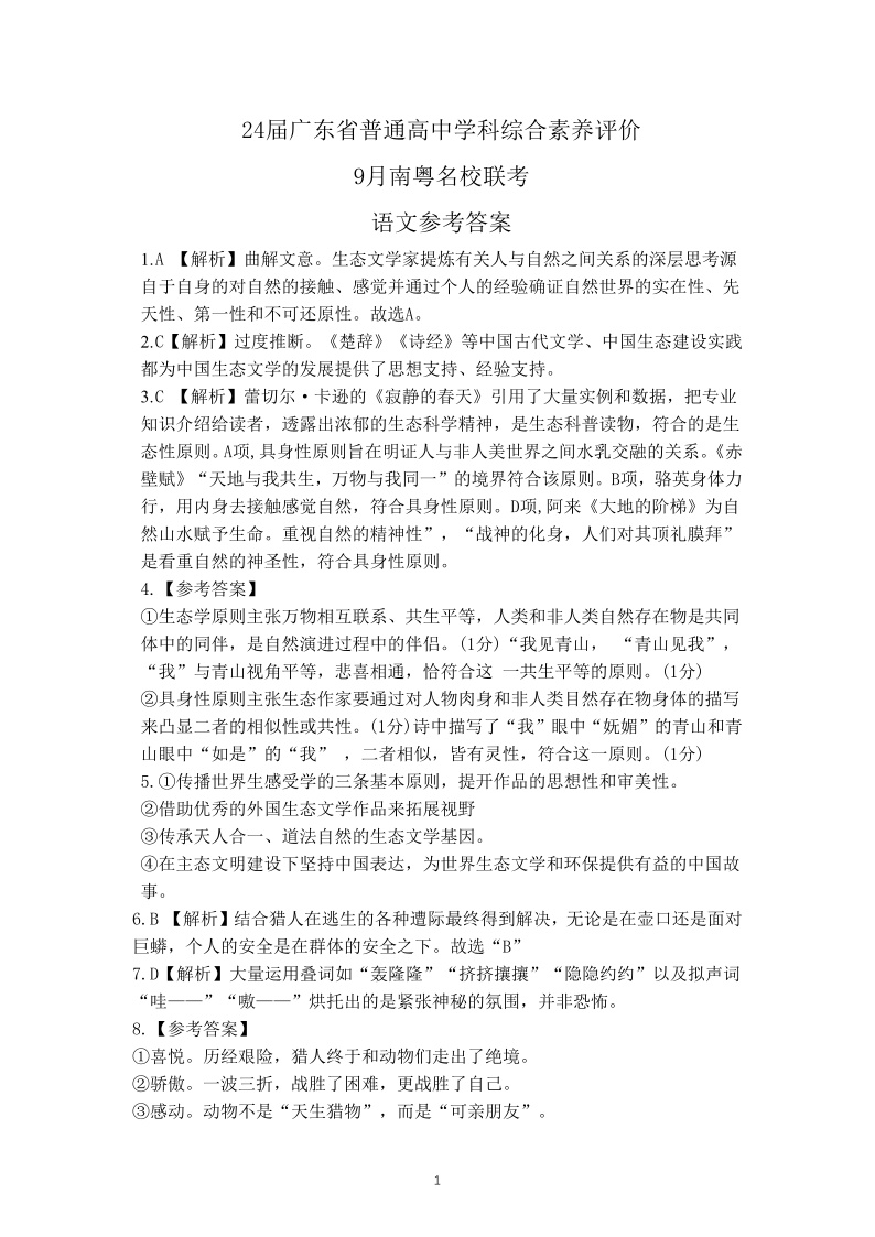 广东省南粤名校联考2023-2024学年高三上学期9月月考 语文答案