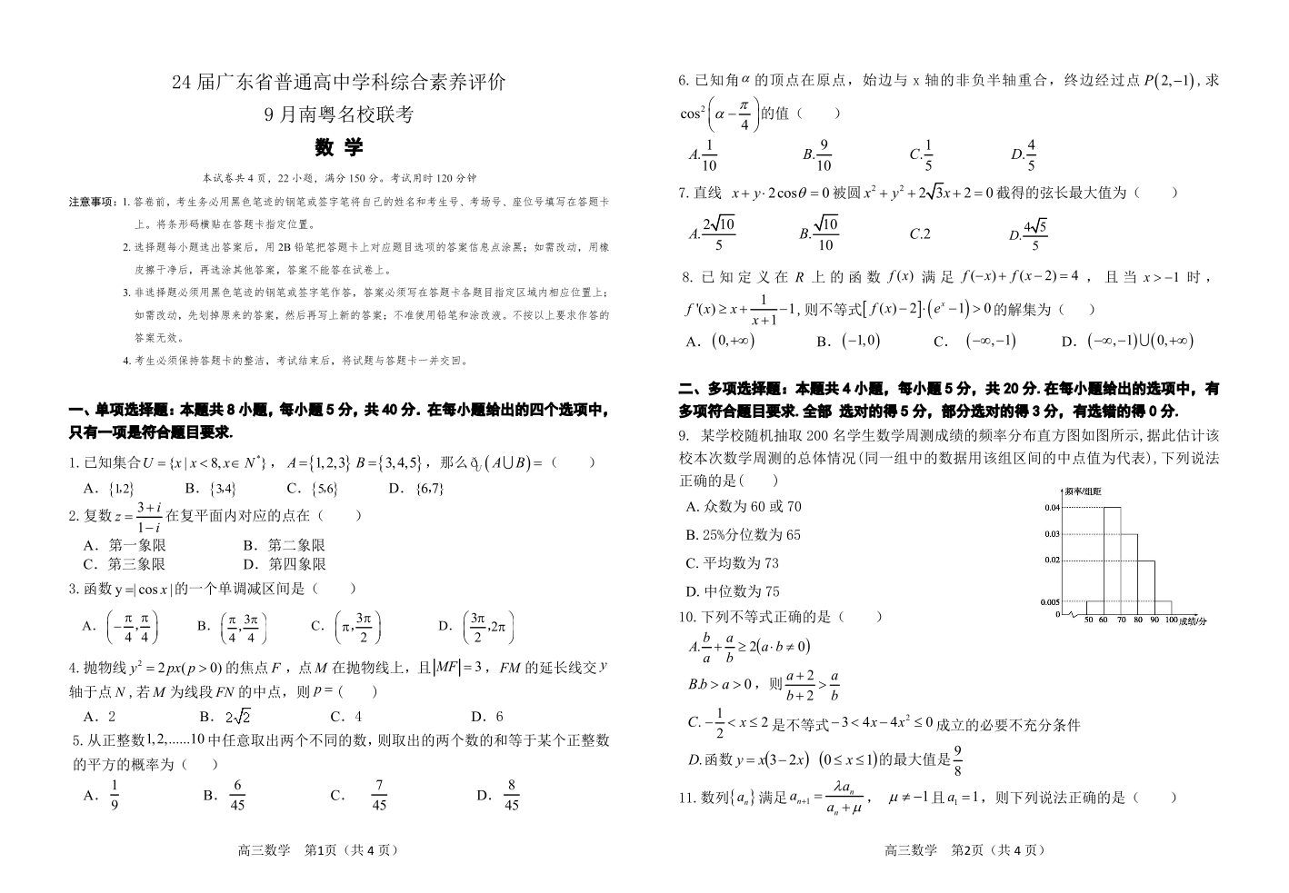 广东省南粤名校联考2023-2024学年高三上学期9月月考 数学