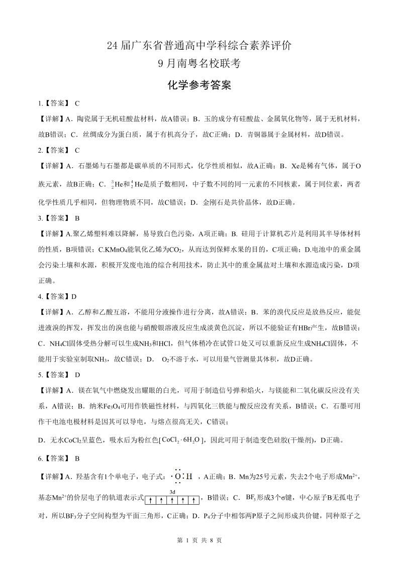 广东省南粤名校联考2023-2024学年高三上学期9月月考 化学答案