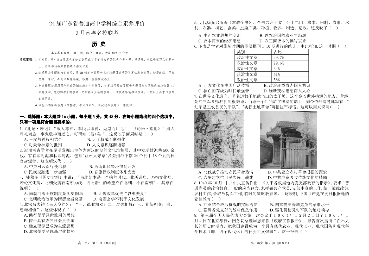 广东省南粤名校联考2023-2024学年高三上学期9月月考 历史