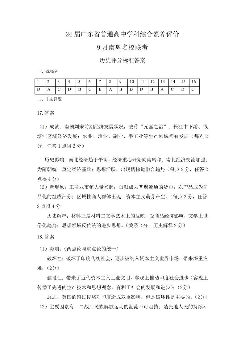 广东省南粤名校联考2023-2024学年高三上学期9月月考 历史答案