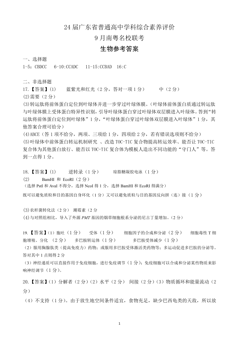 广东省南粤名校联考2023-2024学年高三上学期9月月考 生物答案