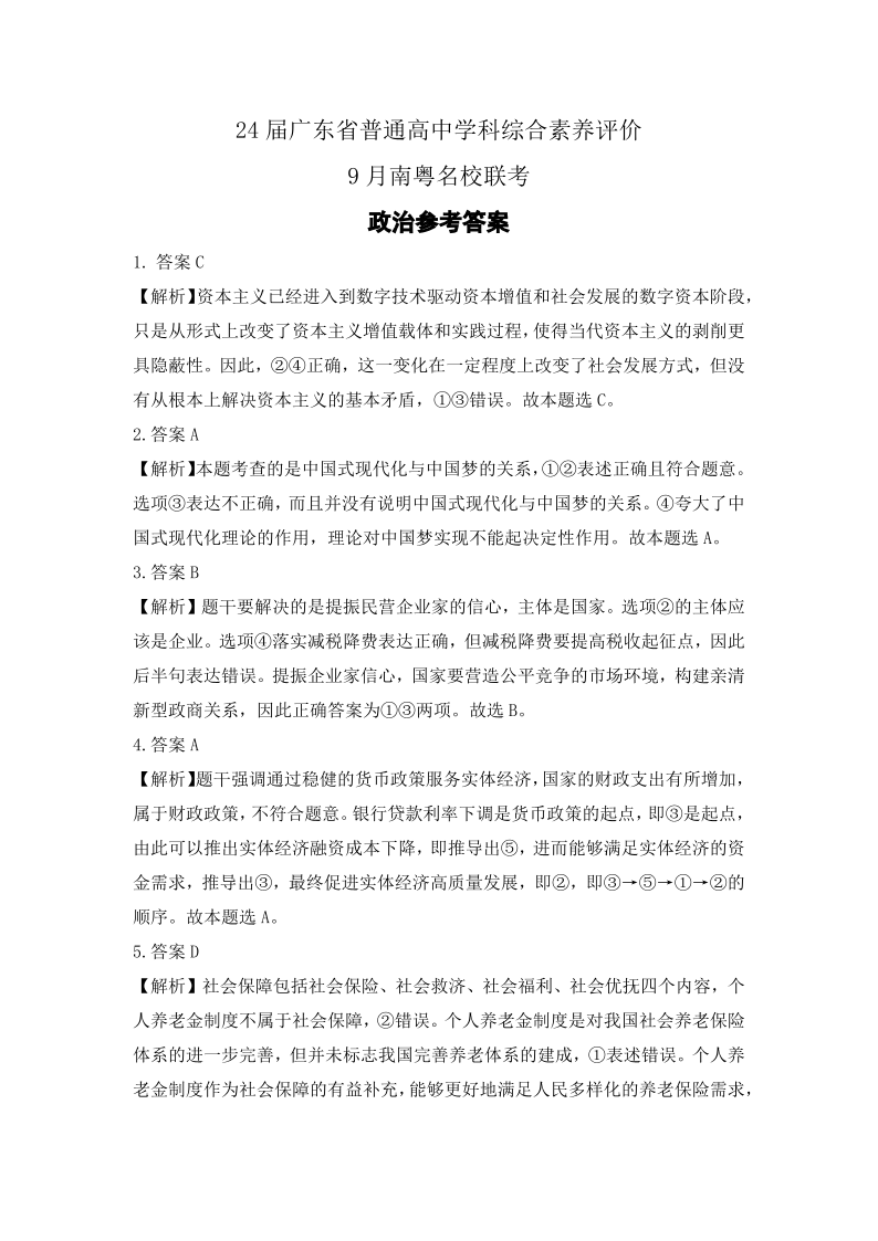 广东省南粤名校联考2023-2024学年高三上学期9月月考 政治答案