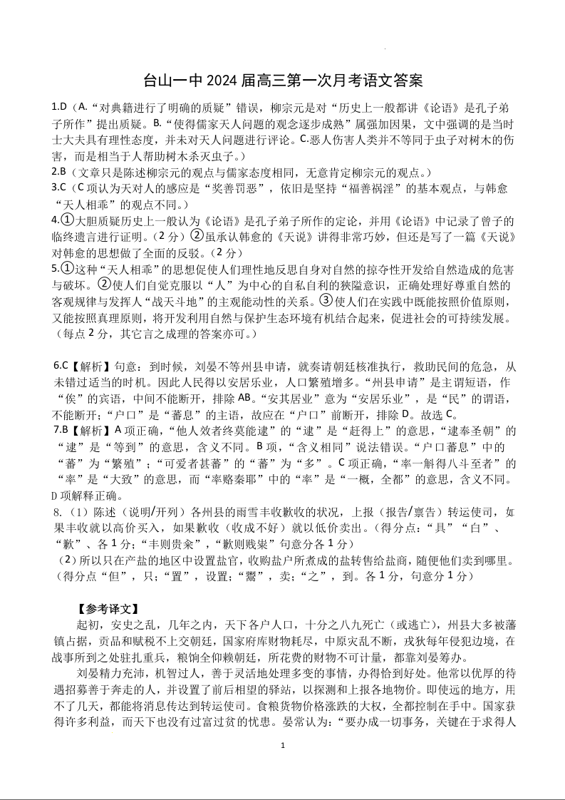 广东省台山市第一中学2023-2024学年高三上学期第一次月考 语文答案