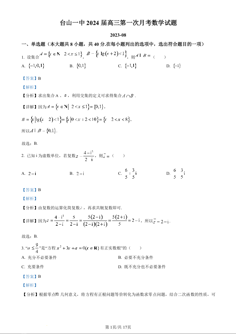 广东省台山市第一中学2023-2024学年高三上学期第一次月考 数学解析