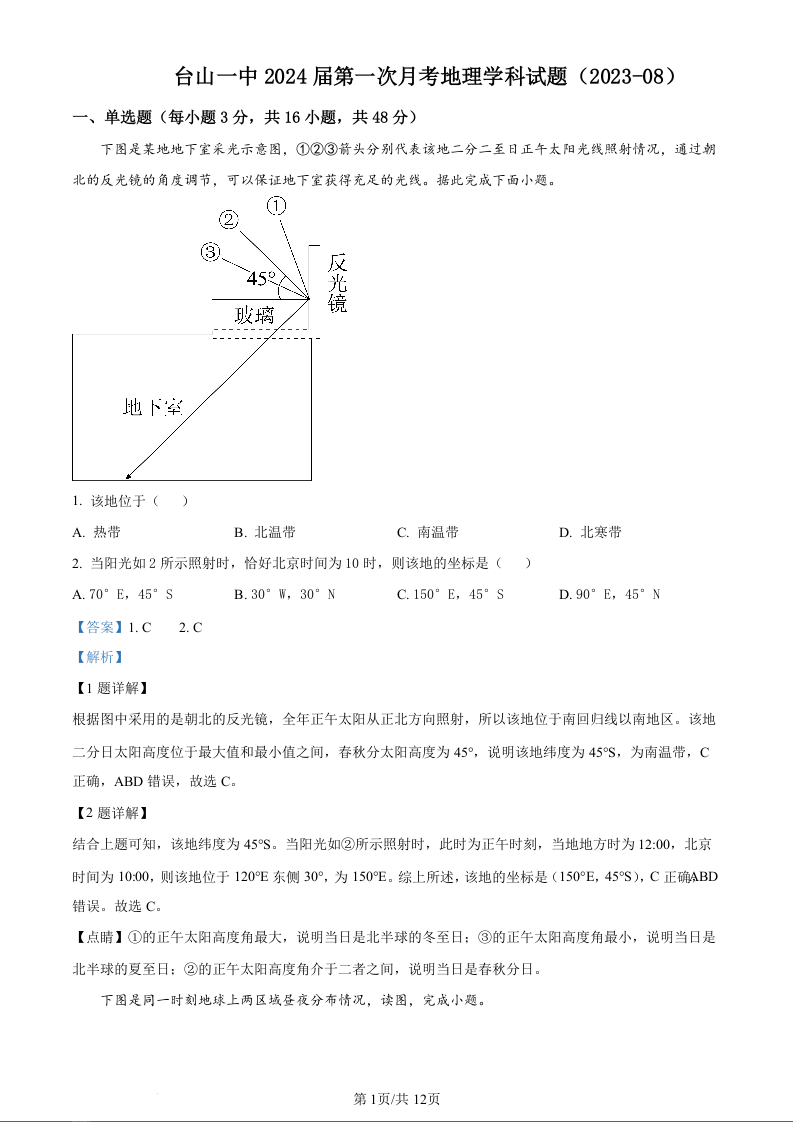 广东省台山市第一中学2023-2024学年高三上学期第一次月考 地理解析