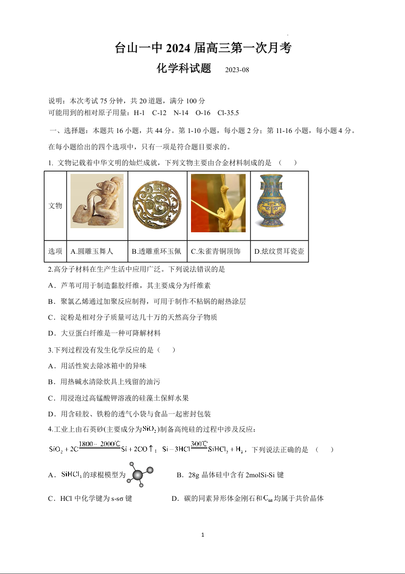广东省台山市第一中学2023-2024学年高三上学期第一次月考 化学
