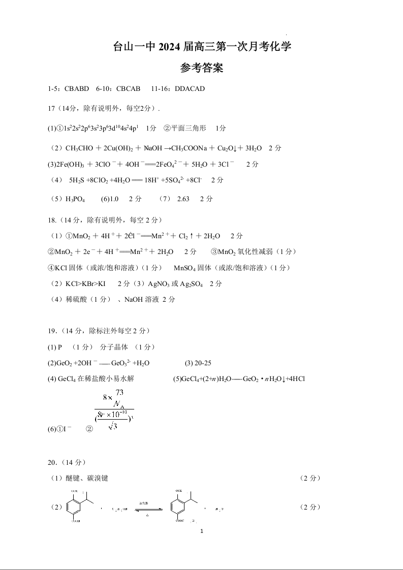 广东省台山市第一中学2023-2024学年高三上学期第一次月考 化学答案