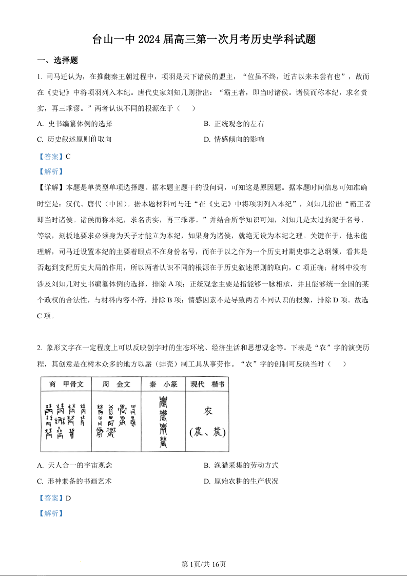 广东省台山市第一中学2023-2024学年高三上学期第一次月考 历史解析