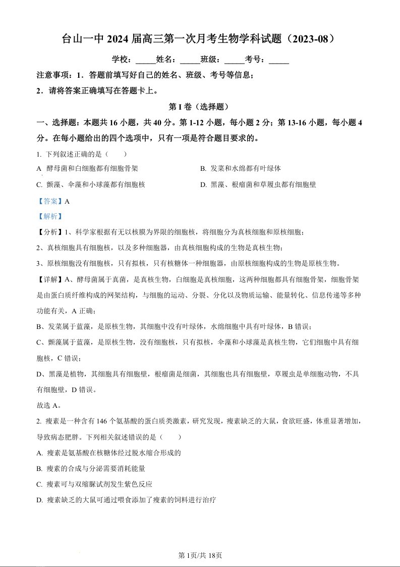 广东省台山市第一中学2023-2024学年高三上学期第一次月考 生物解析