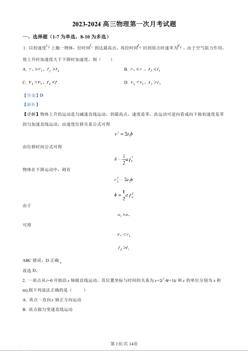 广东省台山市第一中学2023-2024学年高三上学期第一次月考 物理解析