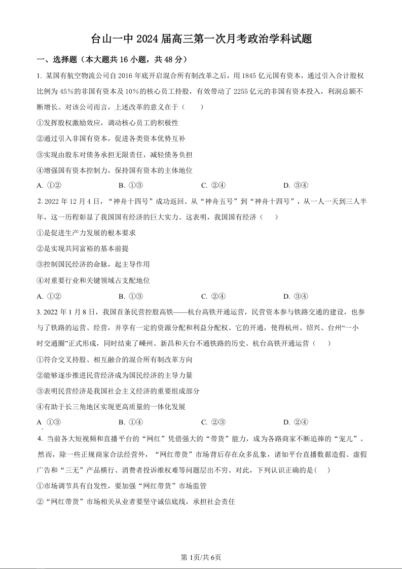 广东省台山市第一中学2023-2024学年高三上学期第一次月考 政治