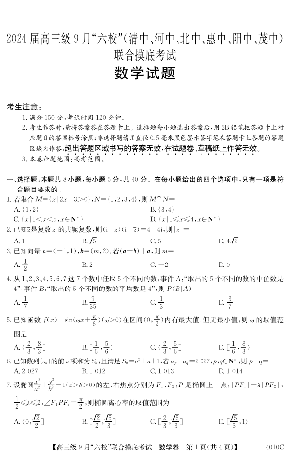 广东省2024届高三级9月“六校”(清中、河中、北中、惠中、阳中、茂中)联合摸底考试 数学