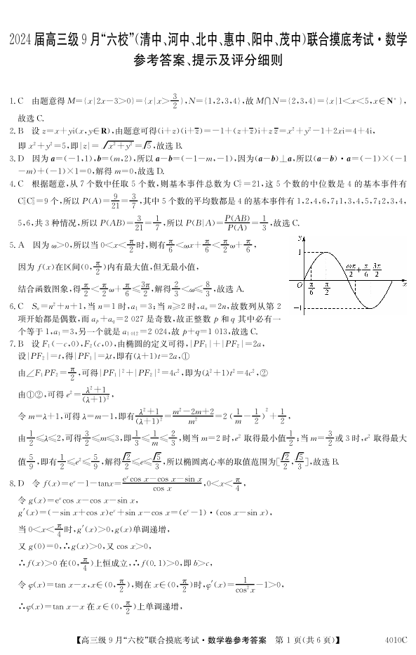 广东省2024届高三级9月“六校”(清中、河中、北中、惠中、阳中、茂中)联合摸底考试 数学答案