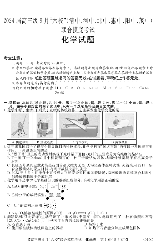 广东省2024届高三级9月“六校”(清中、河中、北中、惠中、阳中、茂中)联合摸底考试 化学