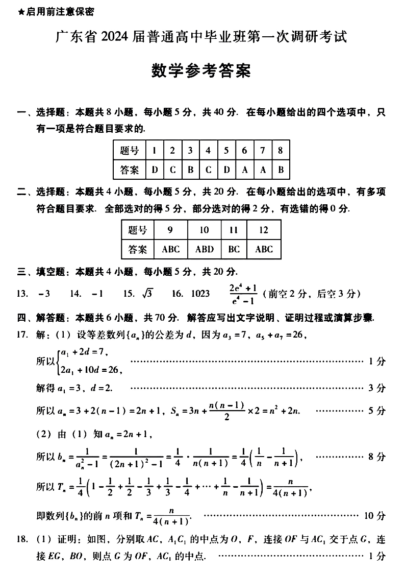 广东省2024届高中毕业班第一次调研考试(粤光联考)数学答案