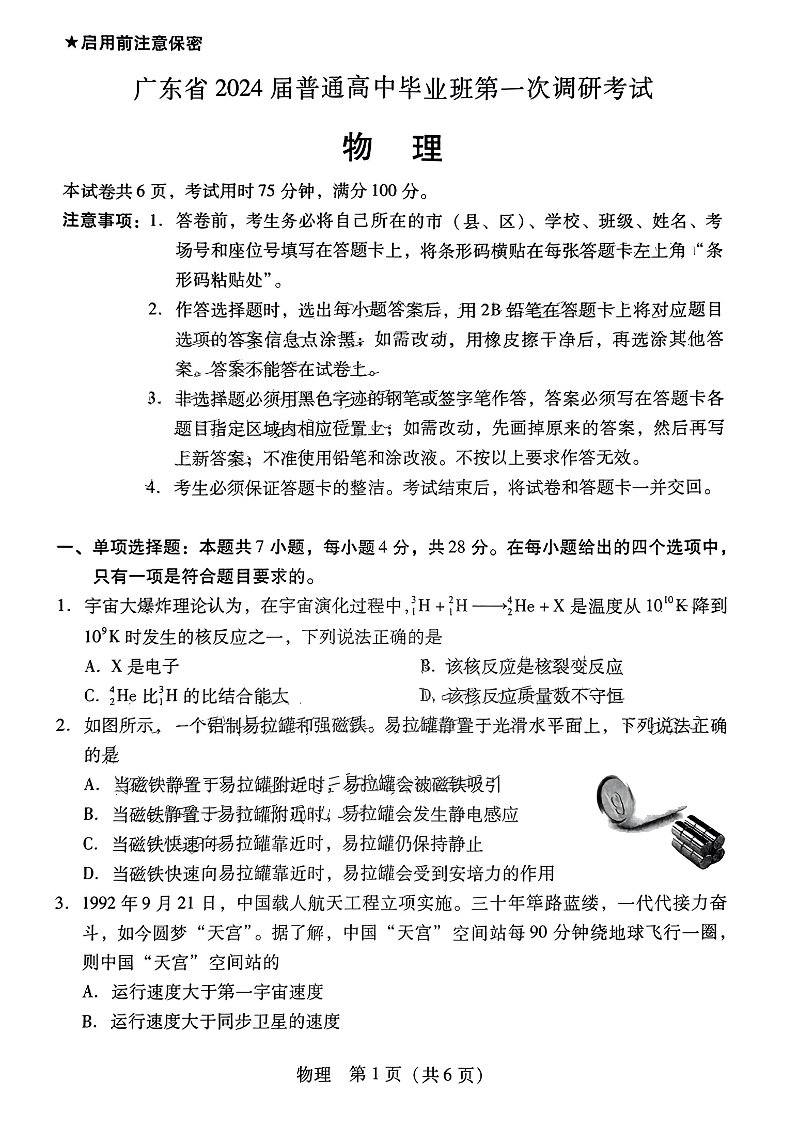 广东省2024届高中毕业班第一次调研考试(粤光联考)物理