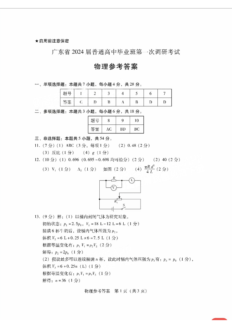 广东省2024届高中毕业班第一次调研考试(粤光联考)物理答案