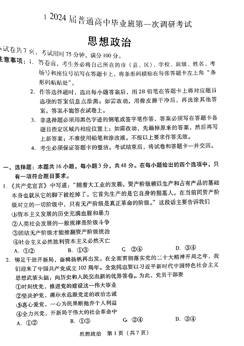 广东省2024届高中毕业班第一次调研考试(粤光联考)政治