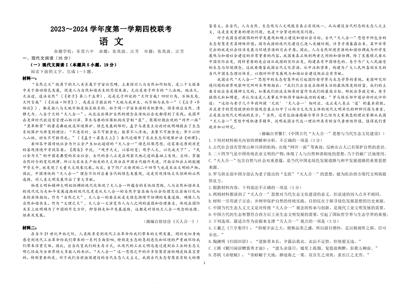 广东省四校联考2023-2024学年高三上学期第一次联考 语文
