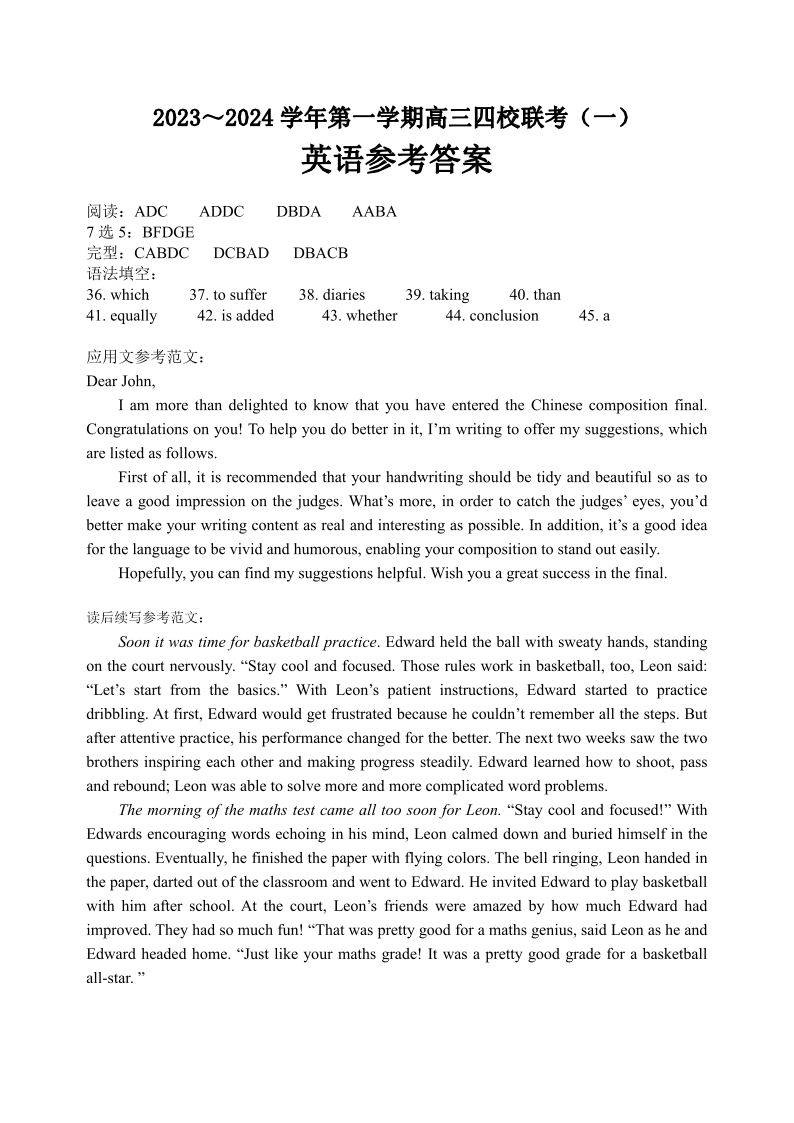 广东省四校联考2023-2024学年高三上学期第一次联考 英语答案