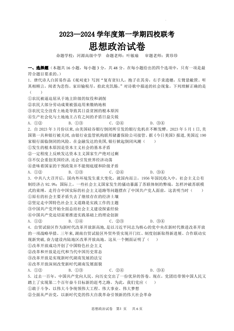 广东省四校联考2023-2024学年高三上学期第一次联考 政治