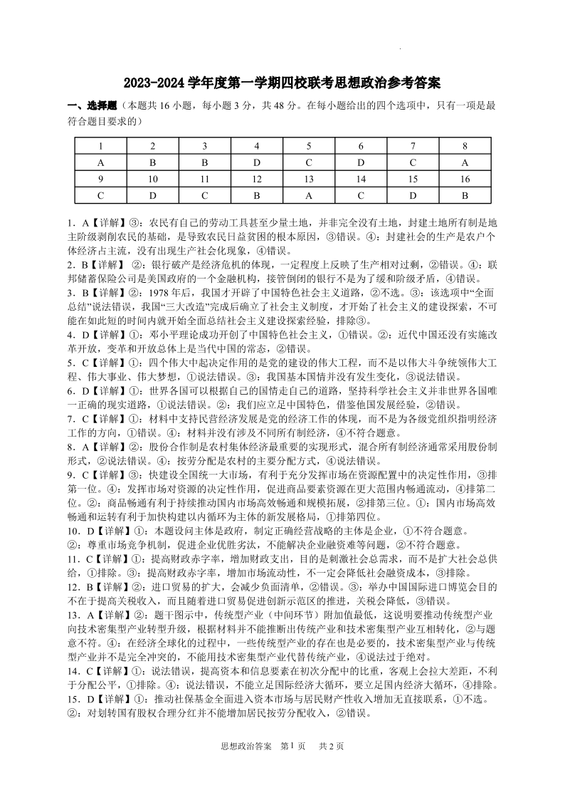 广东省四校联考2023-2024学年高三上学期第一次联考 政治答案