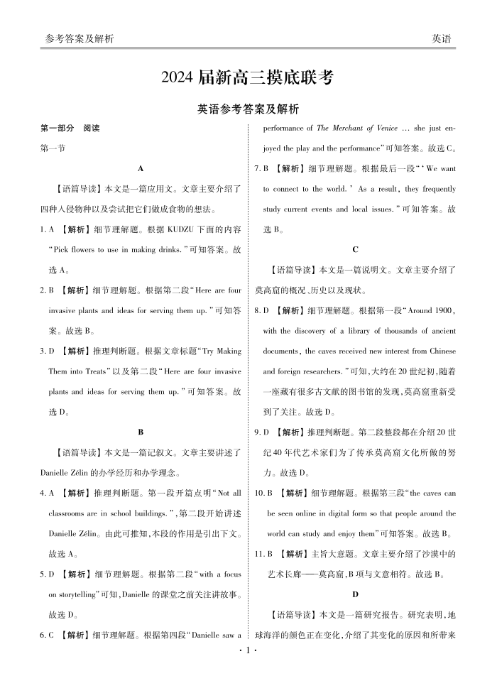 广东省衡水金卷2024届高三上学期摸底联考 英语答案