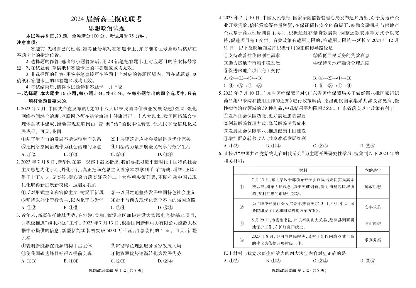 广东省衡水金卷2024届高三上学期摸底联考 政治