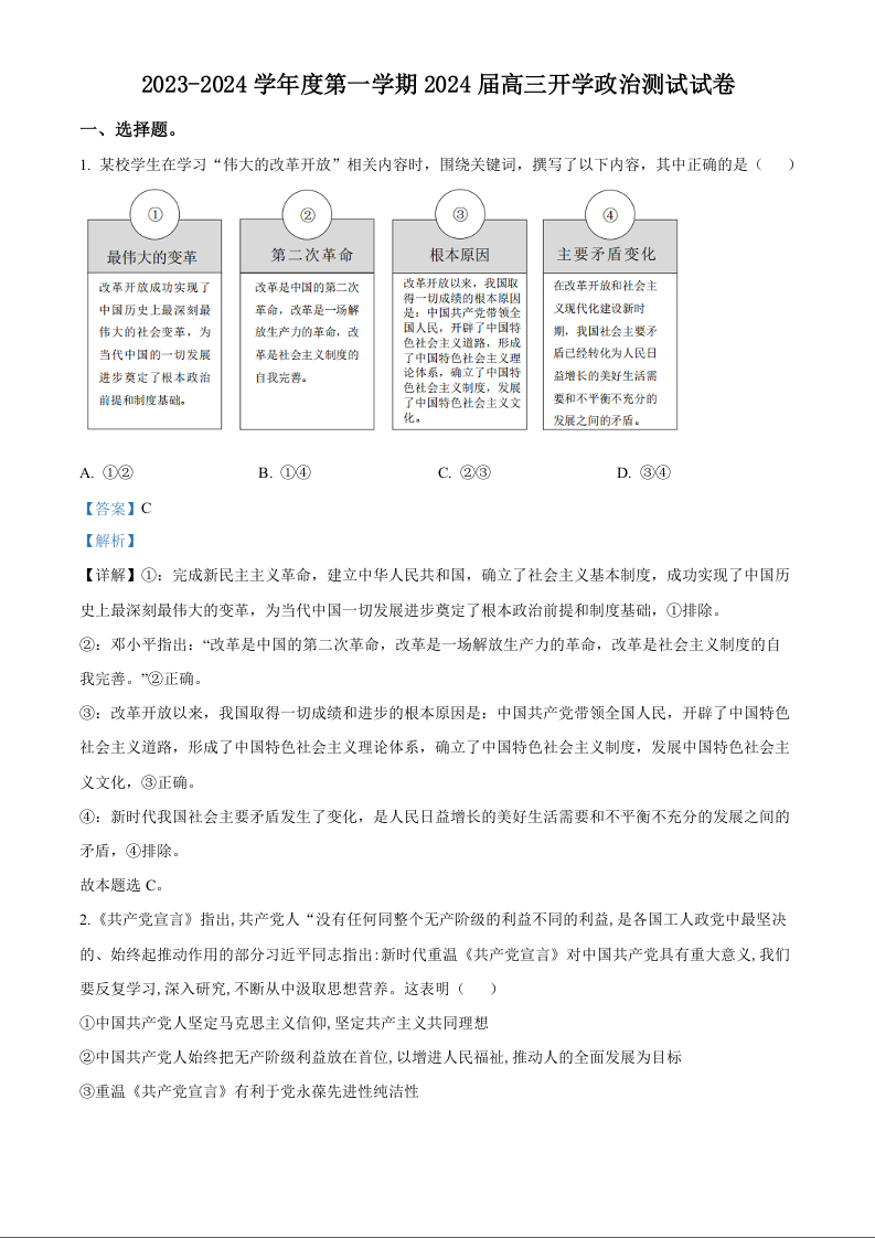 广东省广州市执信中学2023-2024学年高三上学期开学考试 政治试题(解析版)
