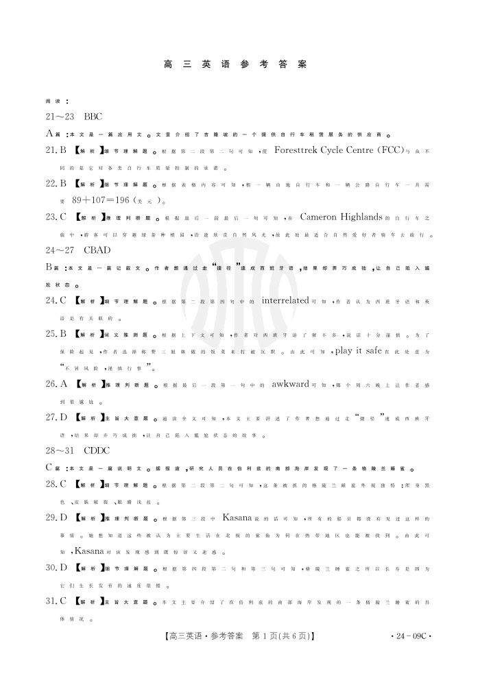 2024届广东省部分学校高三上学期8月联考 英语答案