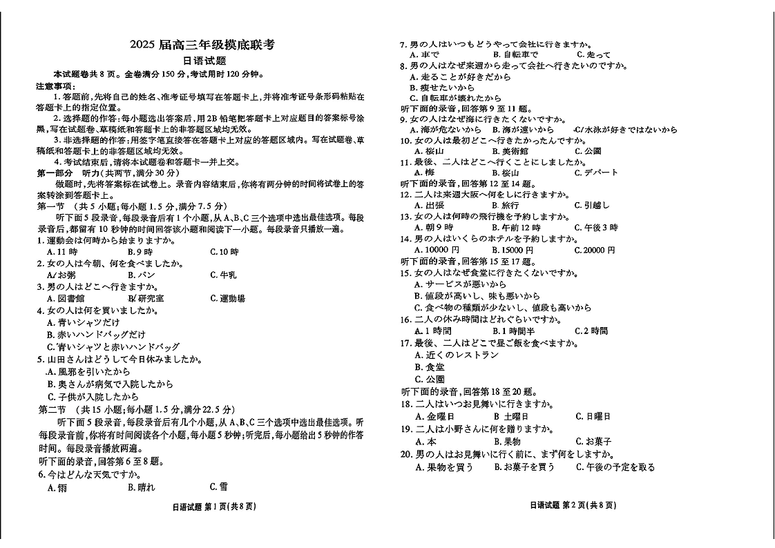 广东省衡水金卷2025届高三年级上学期8月摸底联考+日语