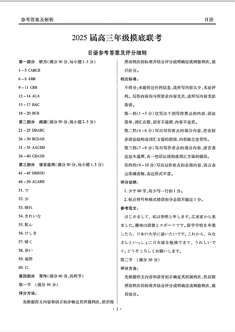 广东省衡水金卷2025届高三年级上学期8月摸底联考+日语答案
