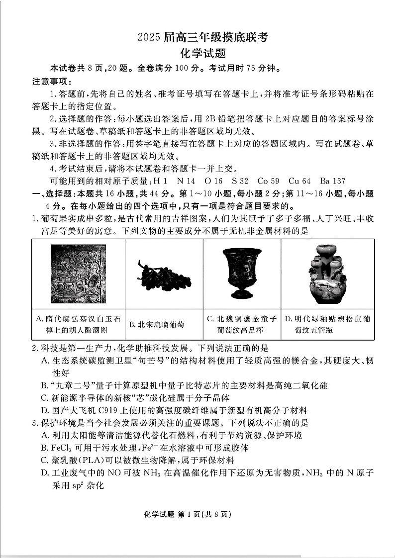 广东省衡水金卷2025届高三年级上学期8月摸底联考+化学