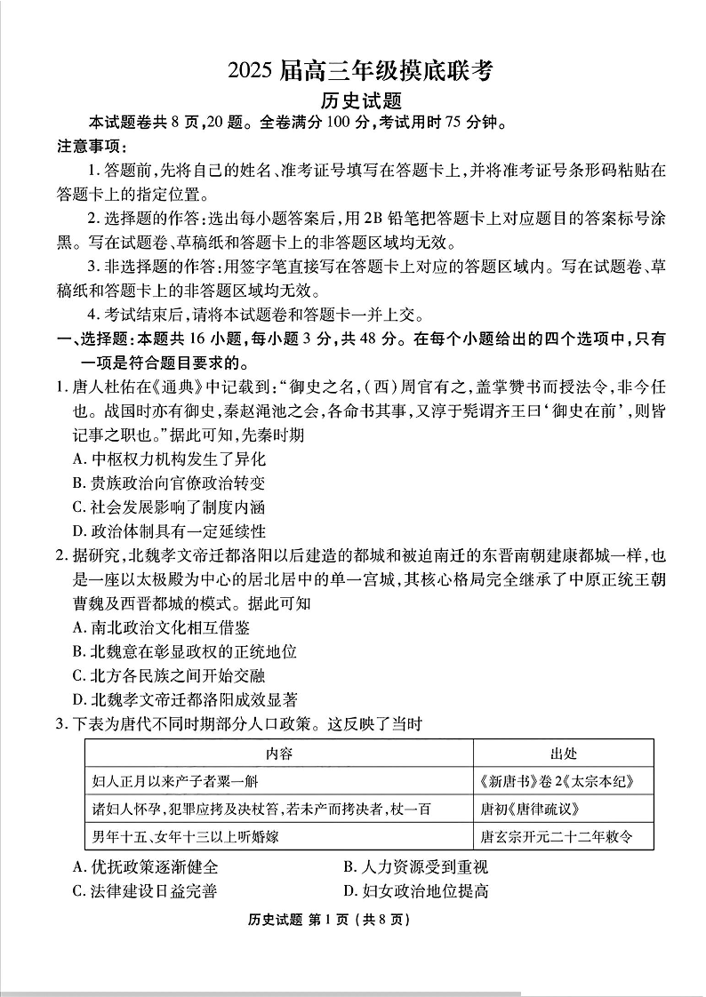 广东省衡水金卷2025届高三年级上学期8月摸底联考+历史