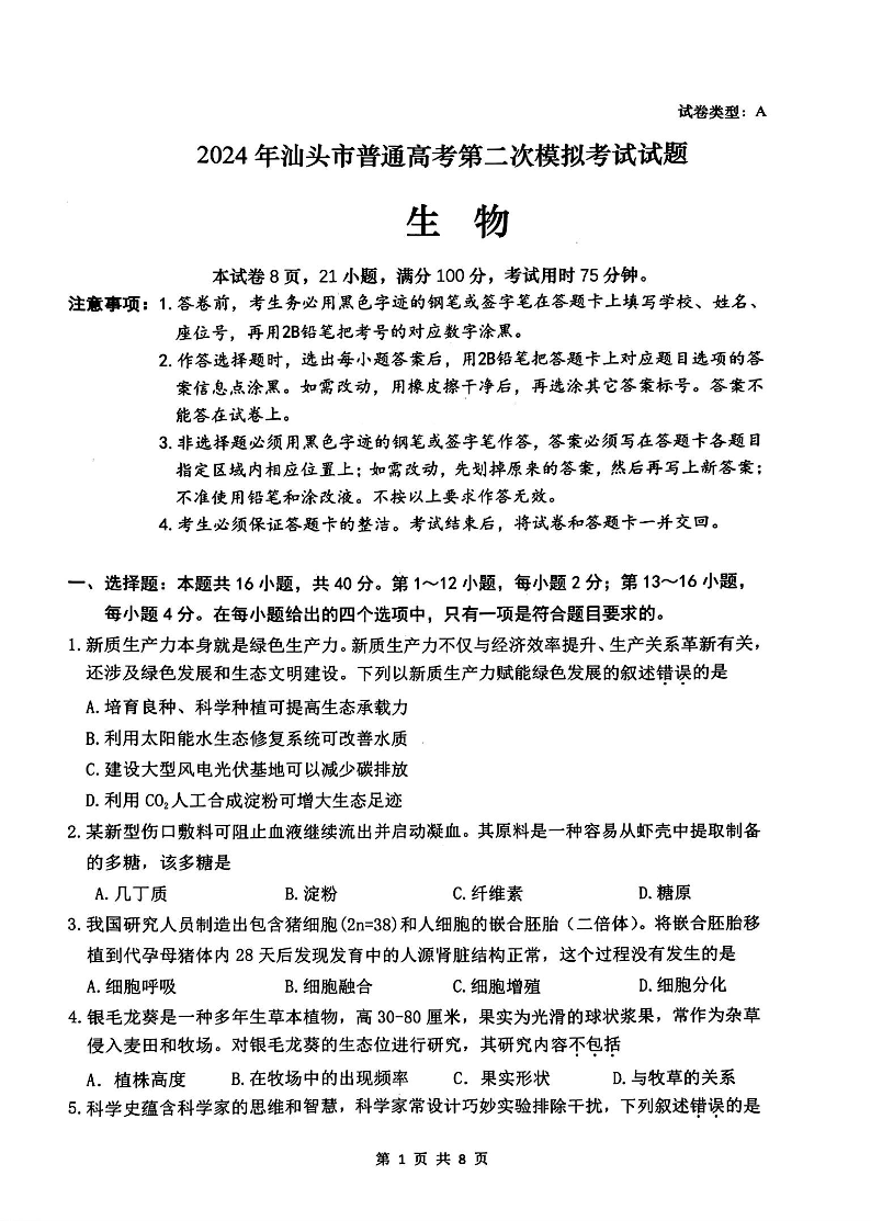 2024年汕头市普通高考第二次模拟考试+生物