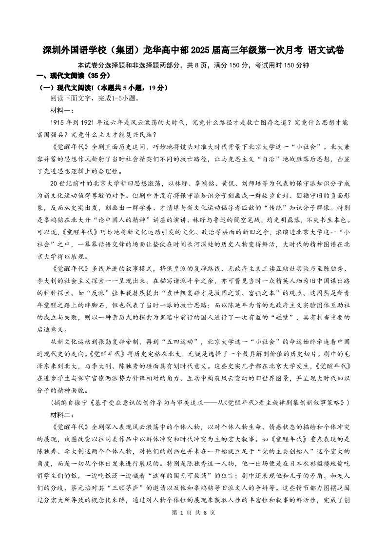 广东省深圳外国语学校(集团)龙华高中部2024-2025学年高三上学期第一次月考+语文