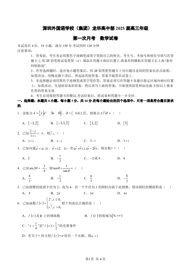 广东省深圳外国语学校(集团)龙华高中部2024-2025学年高三上学期第一次月考+数学